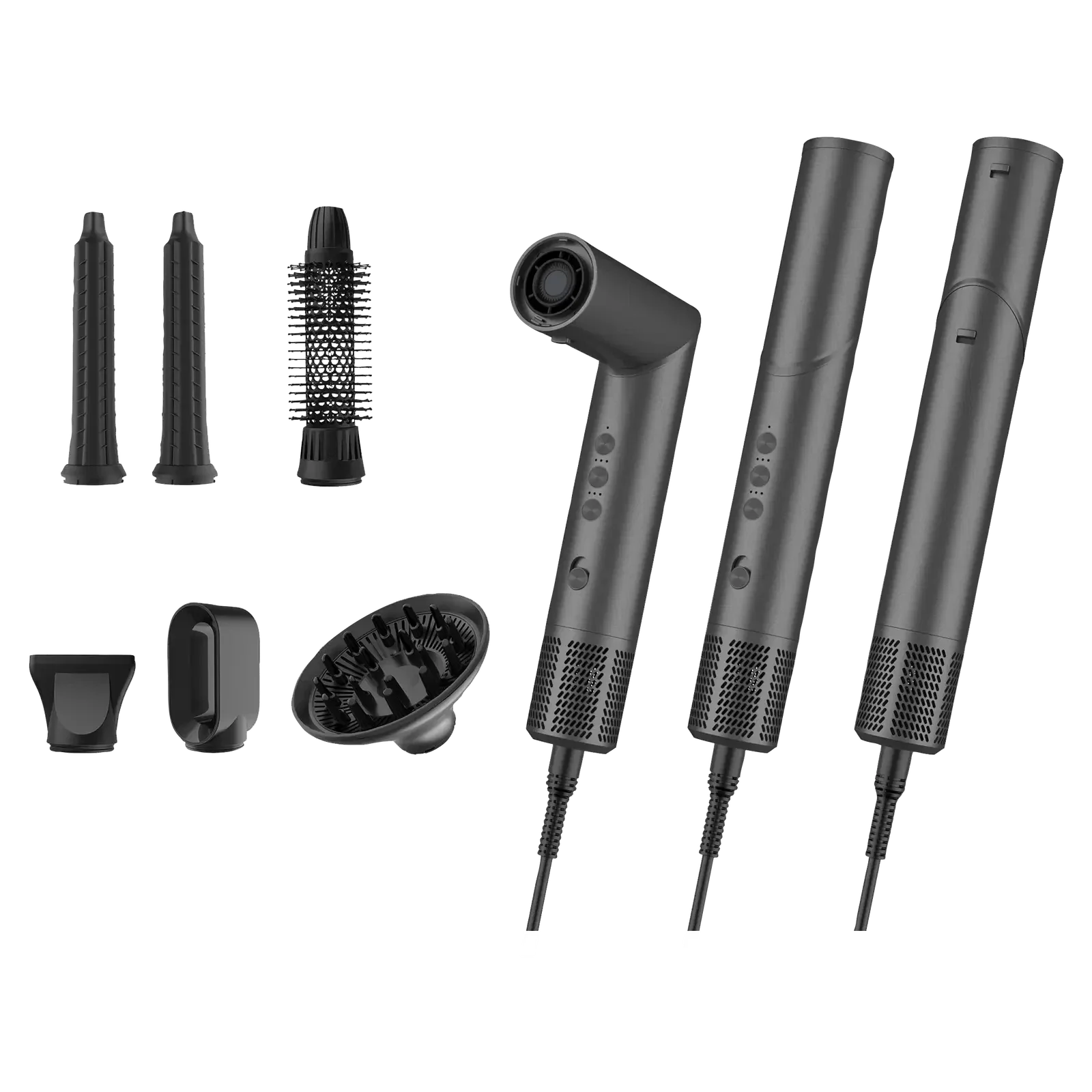 Airstyleren kan, med sine tre temperaturinnstillinger og to hastigheter, brukes både til føning og styling. Det følger med to fønemunnstykker, en diffuser, venstre- og høyrekrølltang samt en varm-luft rundbørste.