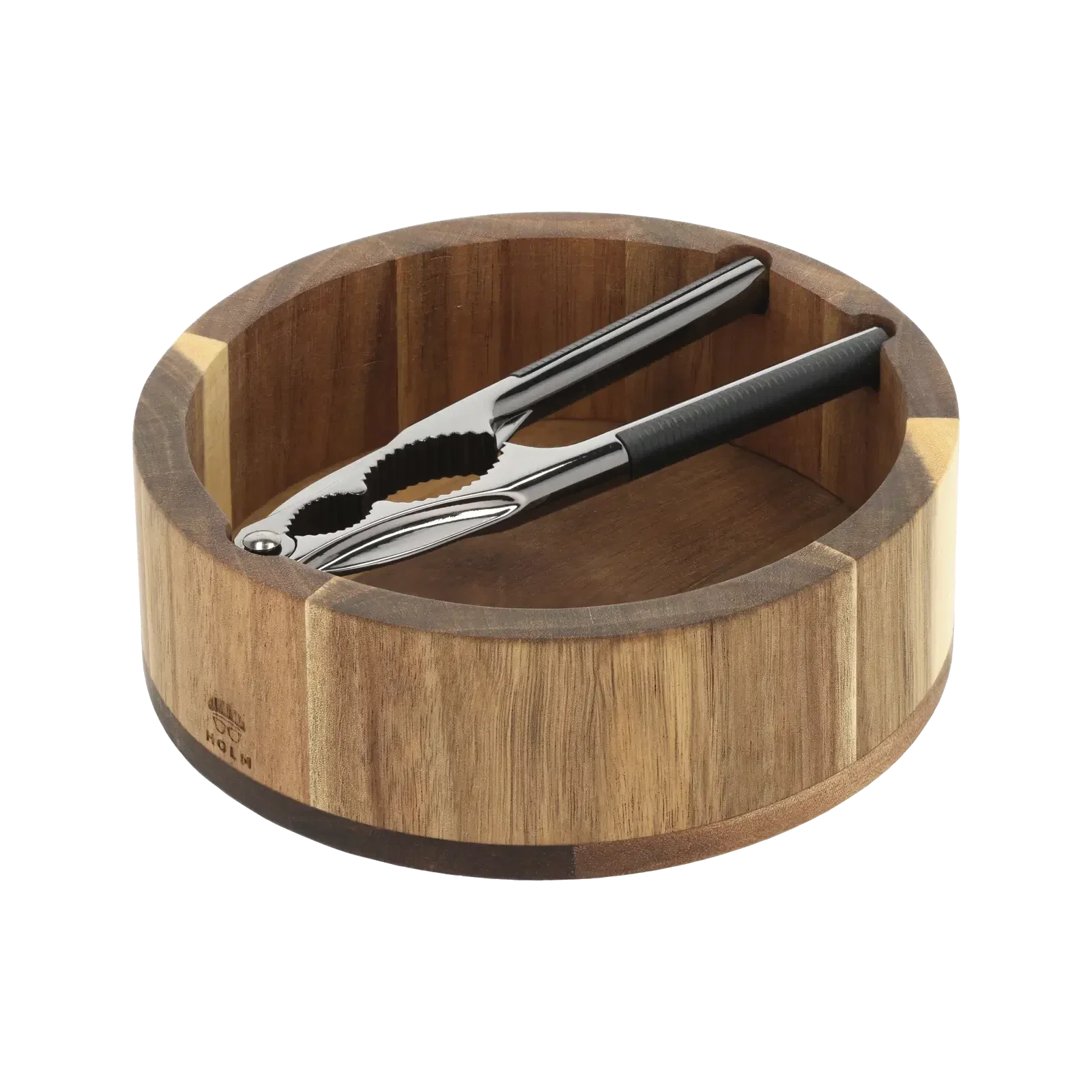 Dette elegante nøtteknekkersettet fra Holm kombinerer funksjonalitet og design i ett. Den runde skålen i akasietre fremhever treets naturlige årringer og gir hvert sett et unikt, rustikt mønster. Nøtteknekkerens metallhode med svart håndtak passer perfekt inn i de små fordypningene på skålen, slik at den alltid er tilgjengelig når nøttene skal knekkes.