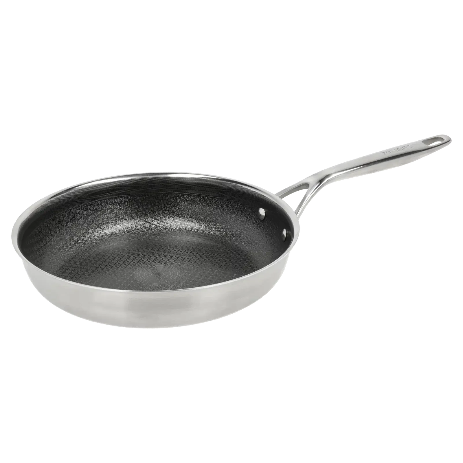 Innsiden har et innovativt hybridbelegg som forener et opphøyd mønster i rustfritt stål med et 2-lags keramisk non-stick-belegg, produsert helt uten PFAS. Resultatet er en slitesterk overflate med utmerkede steke- og kokeegenskaper, enkel rengjøring og fleksibilitet – du kan bruke alle typer redskaper, men vi anbefaler tre, plast eller silikon for optimal levetid.