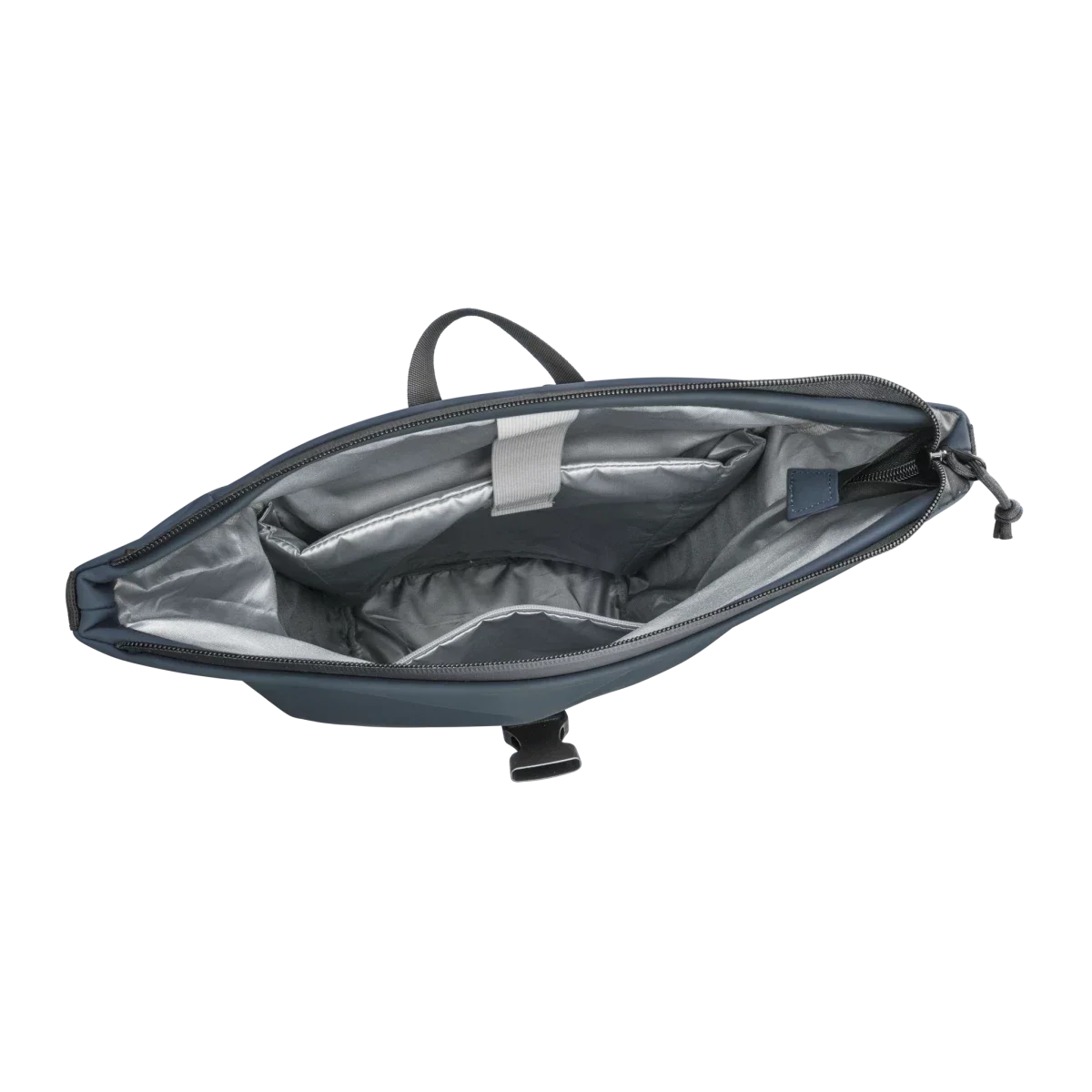 Ryggsekken har et stort hovedrom som lukkes med både glidelås og justerbart rolltop-band med spenne. Innvendig finner du en polstret laptoplomme og et mindre glidelåsrom for oppbevaring av dokumenter eller småting. Utvendig er det en praktisk glidelåslomme på siden for rask tilgang til det du trenger.